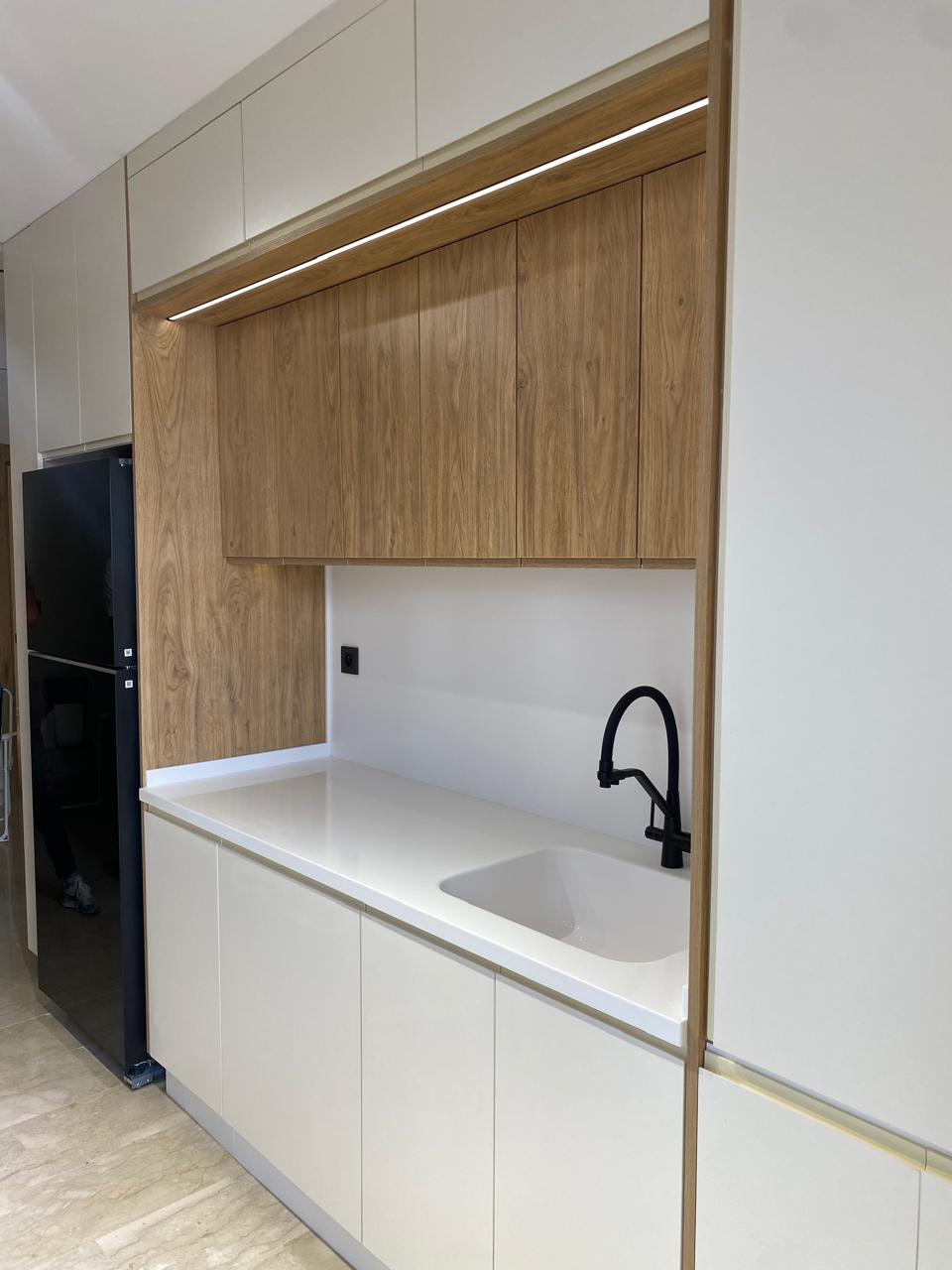 Cette cuisine a été pensée dans un style contemporain, avec des lignes épurées et une harmonie parfaite entre le Corian et le MDF laqué. L’objectif était de créer un espace à la fois chaleureux, lumineux et pratique au quotidien.